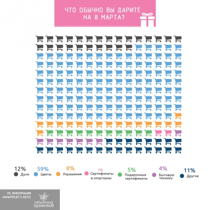 Ранее служба исследований компании HeadHunter назвала самые популярные и оригинальные подарки казахстанцев на 8 Марта. В этот список вошли путевка в Данию, Таиланд и Париж, предложение руки и сердца, фотографии с приглашением на концерт, цветы от супруга, который находился в далекой степи, открытку с живыми бабочками. Также согласно их исследованию, каждый третий казахстанец планировал потратить на подарки не более 10 тысяч тенге, а 20,7 процента опрошенных еще не планировали предстоящие расходы на подарки.