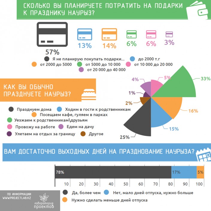 Наряду с этим, отвечая на вопрос, как казахстанцы обычно празднуют Наурыз, 33 процента респондентов отметили, что на Наурыз обычно уезжают к родственникам, 25 процентов празднуют дома, 16 процентов посещают кафе, гуляют в парках. Еще 15 процентов опрошенных пояснили, что ходят в гости к родственникам. Стоит отметить, что около 5 процентов респондентов в это время работают. При этом, 78 процентам казахстанцам более чем достаточно количества выходных дней для празднования Наурыза, 17 процентов опрошенных считают, что им мало дней для отпуска и всего лишь 5 процентов казахстанцев хотят, чтобы сделали меньше дней для отдыха.