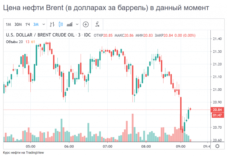 В настоящее время цена на нефть марки Brent находится на уровне 20,8 доллара за баррель.