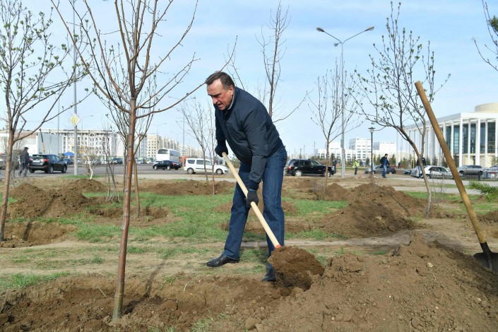 На этот раз субботник для членов Парламента прошел вдоль проспекта Ұлы дала. Помочь городским властям в высадке деревьев вызвались несколько десятков депутатов Мажилиса и Сената.