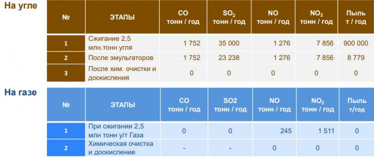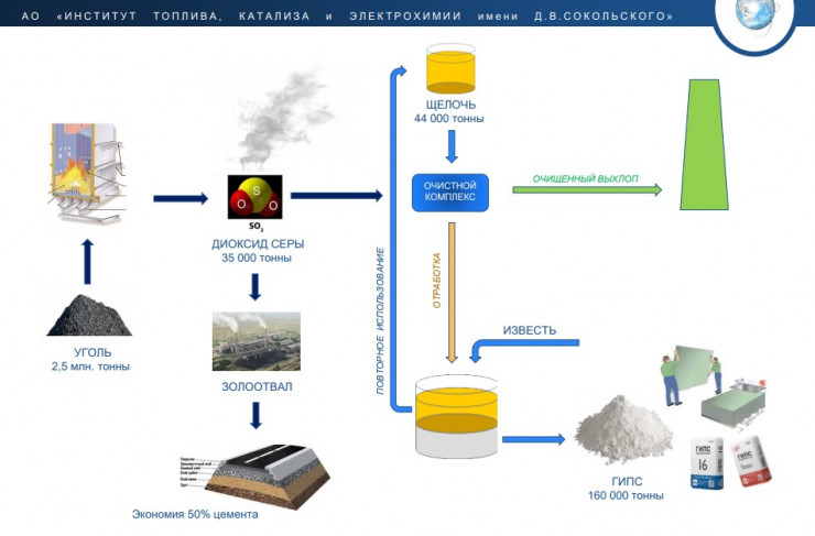 "Сначала у нас идет озонатор и каталитический очиститель, через озонатор здесь мы NO превращаем в NO2, который в дальнейшем будет улавливаться щелочью в ходе химической реакции. Щелочь не выбрасывается, она идет через очистное сооружение. Туда добавляем известь, получаем осадок, это уже наш гипс. Щелочь то есть будет циркулировать. Из расчета, что 2,5 миллиона тонн угля сжигается, то в результате мы можем получить 160 тысяч тонн гипса, а гипс - это строительный материал, необходимый всем", - добавил он.