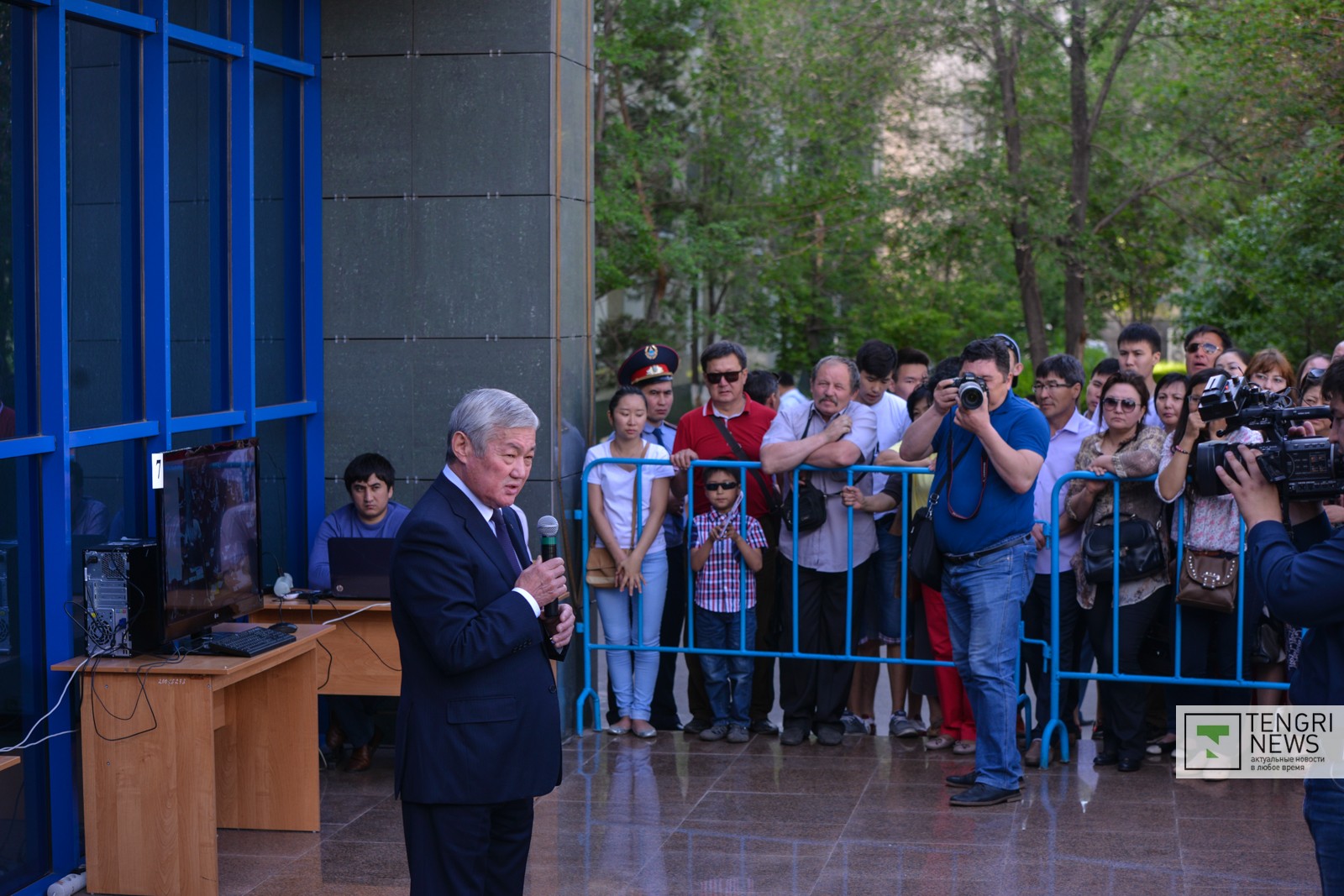 Родители, родственники, друзья терпеливо ждут выпускников у ограждений. Возле здания установлены мониторы, на кадрах которых в режиме онлайн выводится картинка из аудиторий, где выпускники сдают ЕНТ-2015.