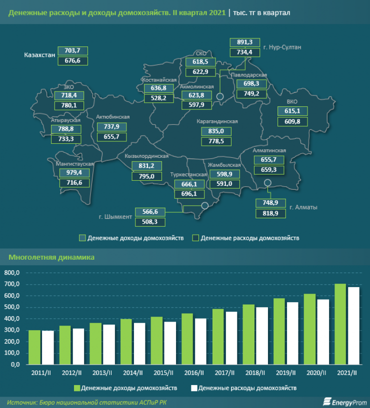 Аналитики отметили, что во втором квартале 2021 года средний расход одного казахстанского домохозяйства на коммунальные услуги, содержание жилья и ремонт составили 34,5 тысячи тенге. Это на 17,6 процента больше в денежном выражении, чем годом ранее, и на 36,3 процента выше, чем пять лет назад. При этом общие денежные расходы одного домохозяйства в этот же период составили 676,6 тысячи тенге, что на 19,5 процента больше, чем в аналогичном периоде прошлого года. Денежные доходы домохозяйств во втором квартале выросли на 13,5 процента до 703,7 тысячи тенге.