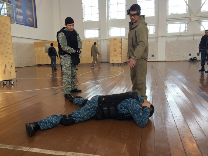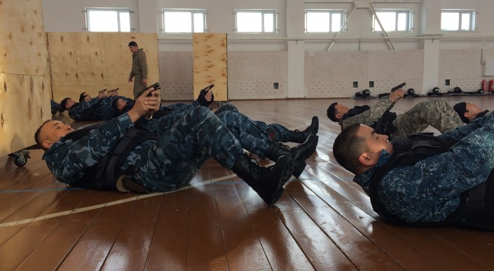 "Здесь огневая подготовка проводится, личный состав будет стрелять в бронежилетах, будет стрелять после физических и психологических нагрузок. Сначала сто метров челночного бега, затем будут задаваться ему вопросы в качестве психологического давления, потом будет отжиматься от пола, потом кружиться вокруг своей оси и после этого стреляют на скорость. За десять секунд должно произойти четыре выстрела по установленным целям", - поясняет журналистам генерал-майор Оспанов.