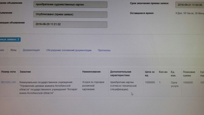 Акимат Актюбинской области разместил еще несколько лотов на открытом сайте государственных закупок. Корреспондент Tengrinews.kz, помимо кресла с позолоченными элементами, обнаружил заказ других предметов роскоши, а именно - набор "высокохудожественной посуды" стоимостью 540 тысяч тенге, художественных картин за 1,5 миллиона тенге, водопад по стеклу за 1,6 миллиона тенге, штор за 1,8 миллиона тенге.