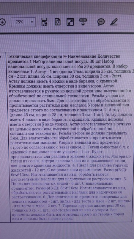 В описании к лоту говорится, что планируется приобрести набор национальной посуды из 30 предметов. Он включает в себя астау, выполненный вручную из цельной доски ивы, высушенной и обработанной по специальной технологии. Ножки должны быть выполнены в виде баранов. В набор также входят пиала для рассыпчатых продуктов, тегеш из сосны и другие виды национальной дорогой посуды.
