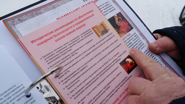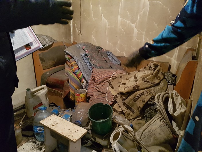 Рядом топится печь и сушится обувь. Сотрудники ДЧС, которые проводят рейд по технике безопасности, сделали замечание за ненадлежащее состояние печи.