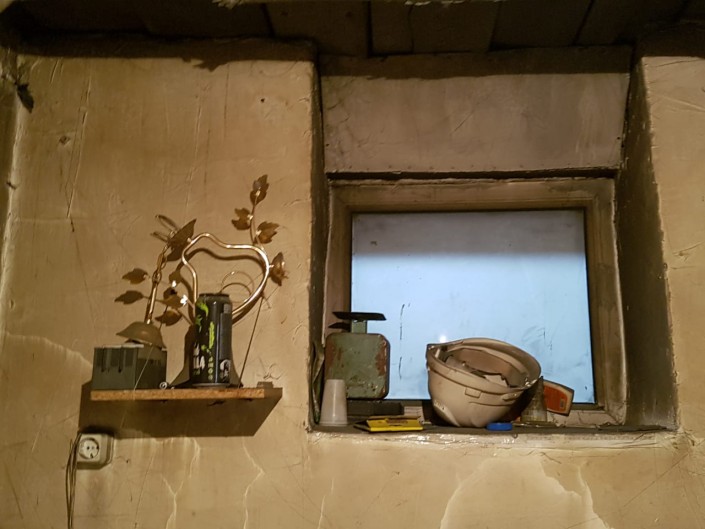В угольной пылятся подсвечник, весы и строительная каска.