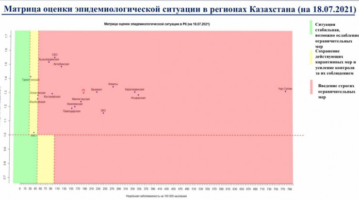 Отметим, что Восточно-Казахстанская и Туркестанская области вчера, 17 июля, находились в "зеленой" зоне.