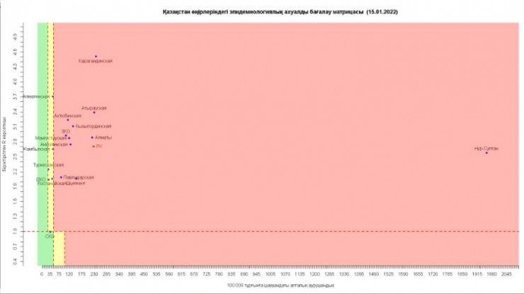 Два региона перешли из "зеленой" зоны в "желтую", передает корреспондент Tengrinews.kz со ссылкой на матрицу оценки эпидемиологической ситуации в регионах Казахстана на 15 января 2022 года.