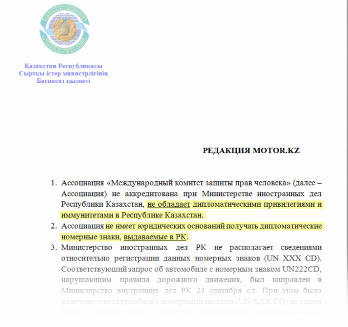 Редакция обратилась в МИД РК, где сообщили, что Ассоциация "Международный комитет защиты прав человека" не обладает никакими дипломатическими привилегиями. Более того, представители Министерства иностранных дел уже направили запрос по этому поводу в МВД РК.