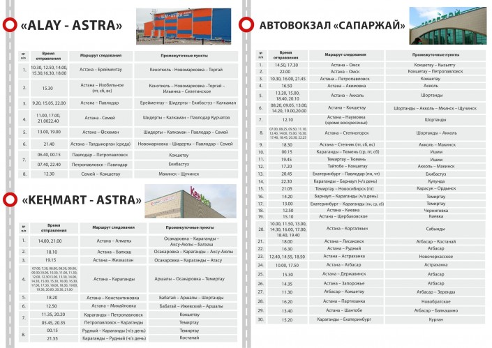Новые схемы движения будут проходить по объездным дорогам без заезда в центр города. Транспортный центр "Алай-Astra" расположен по улице С 316, строение 5 (за Центральным рынком). Адрес "КенМарт-Astra": трасса Астана - Караганда, здание 45.