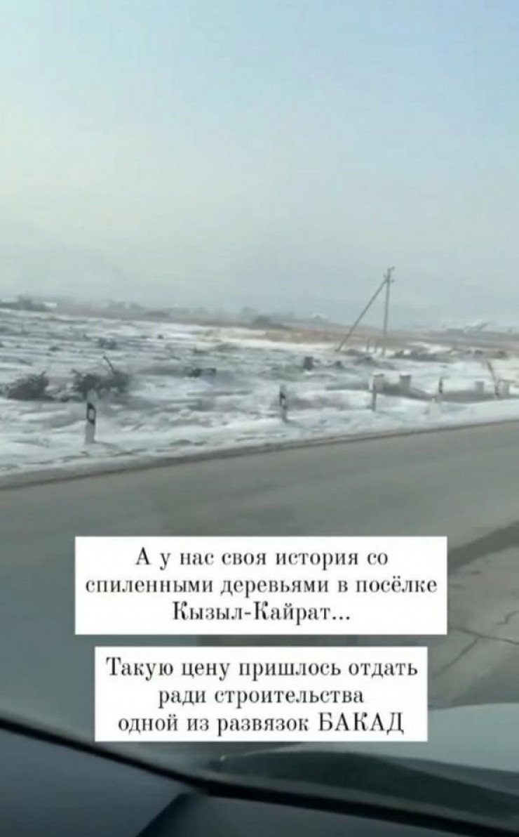 "У нас своя история со спиленными деревьями в поселке Кызылкайрат. Такую цену пришлось отдать ради строительства одной из развязок БАКАД", - написал автор публикации.