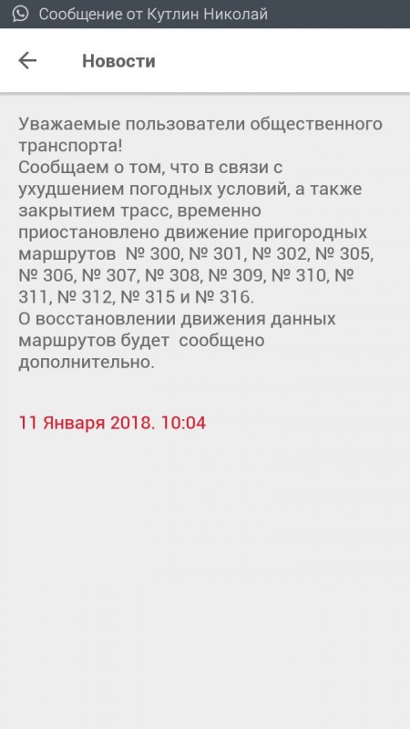 "Сообщаем о том, что в связи с ухудшением погодных условий, а также закрытием трасс временно приостановлено движение пригородных маршрутов  № 300, № 301, № 302, № 305, № 306, № 307, № 308, № 309, № 310, № 311, № 312, № 315 и № 316. О восстановлении движения данных маршрутов будет сообщено дополнительно", - отмечается в информации из мобильного приложения компании.