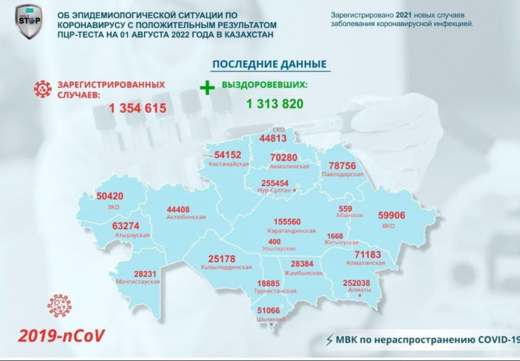 В Казахстане за прошедшие сутки (1 августа) зарегистрирован 2021 новый случай заболевания коронавирусной инфекцией, передает Tengrinews.kz со ссылкой на МВК по нераспространению COVID-19.