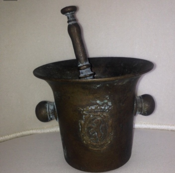 "Бронзовая ступка производства Германии с фамильным гербом. Примерно 1910 год. Высота - 12 сантиметров, верхний диаметр - 14 сантиметров", - описывает товар нынешний владелец.