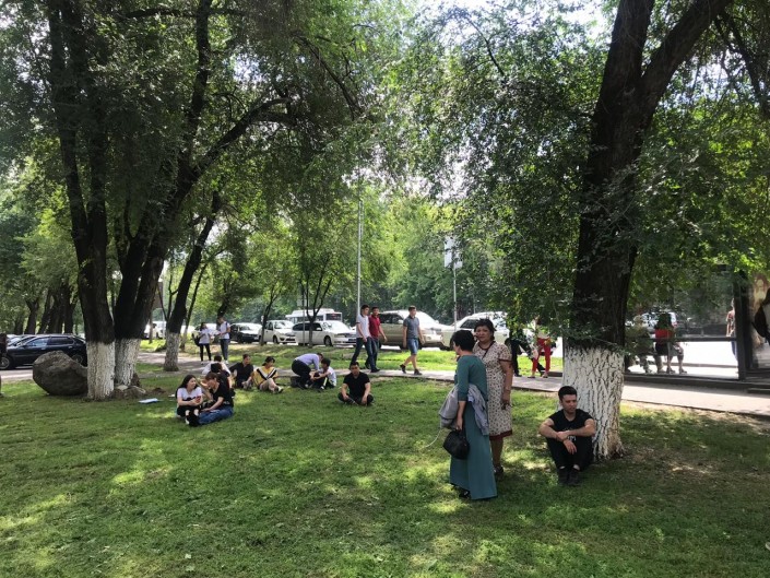 Алматинка Гульмира Гасанова тоже ждет, когда выйдет ее дочь. Говорит, с утра у девочки в горло кусок не лез. Переживает, справляется ли она с заданиями.