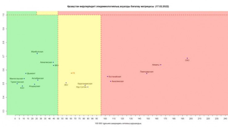 Таким образом, в "красной" зоне остаются: Алматы, Акмолинская, Костанайская, Павлодарская, Северо-Казахстанская области.