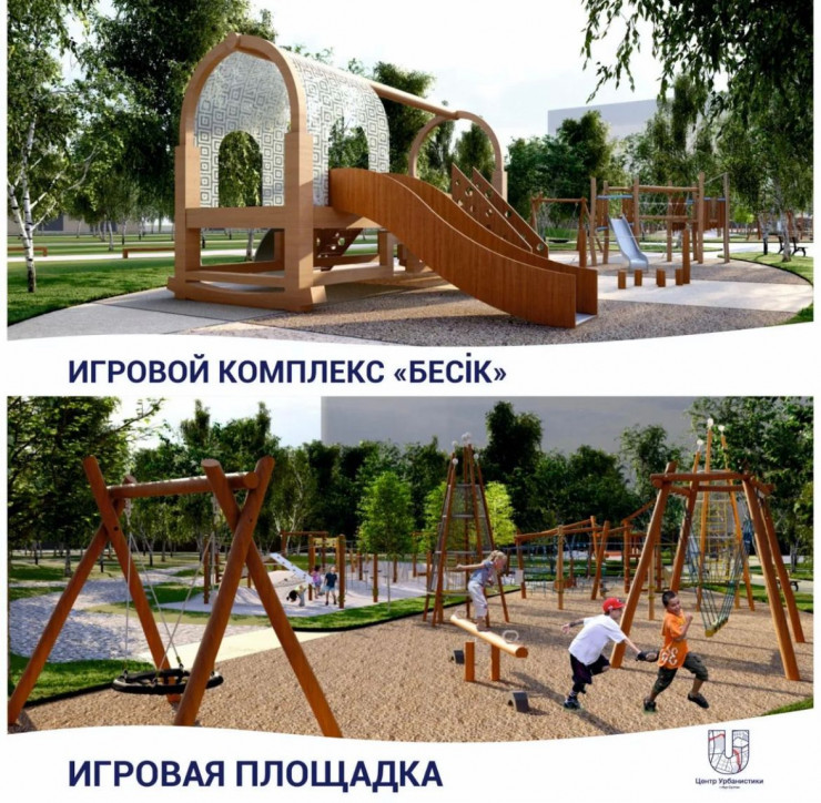 Здесь же планируется озеленение парка лиственными деревьями и многолетними кустарниками. Также будут установлены беседки, качели и гамаки среди деревьев.