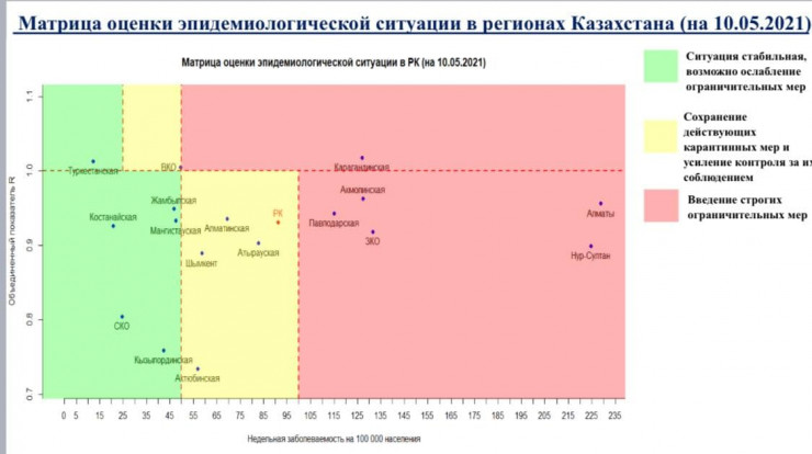По эпидемиологической ситуации в регионах Казахстана на 10 мая в "красной" зоне находятся Нур-Султан, Алматы, Акмолинская, Западно-Казахстанская, Карагандинская и Павлодарская области.