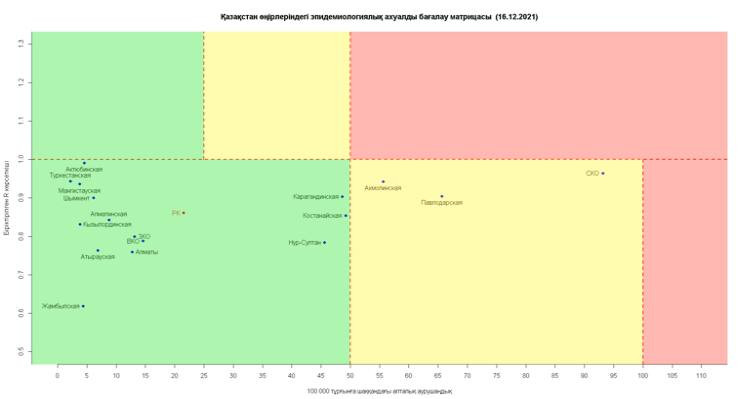 Костанайская область перешла из "желтой" зоны в "зеленую" по распространенности коронавируса, передает корреспондент Tengrinews.kz. Об этом свидетельствует матрица оценки эпидемиологической ситуации в регионах Казахстана на 16 декабря 2021 года.