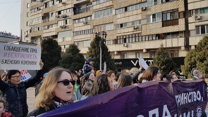 Марш продлился менее десяти минут. Активисты движения KazFem выкрикивали лозунги и в руках держали различные плакаты.