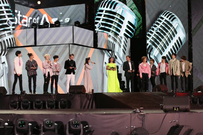 Южнокорейский бойзбенд PENTAGON зажег на сцене с музыкальными номерами Can you feel it, Sha la la, Pretty pretty, Naughty boy, Spring snow и Shine.