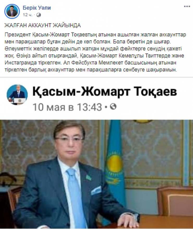 "Было много фальшивых аккаунтов и страниц, открытых от имени Президента Касым-Жомарта Токаева. Касым-Жомарт Кемелевич зарегистрирован в Twitter и Instagram. И я призываю вас не доверять всем аккаунтам и страницам, зарегистрированным от имени Главы государства в Facebook", - заявил пресс-секретарь.