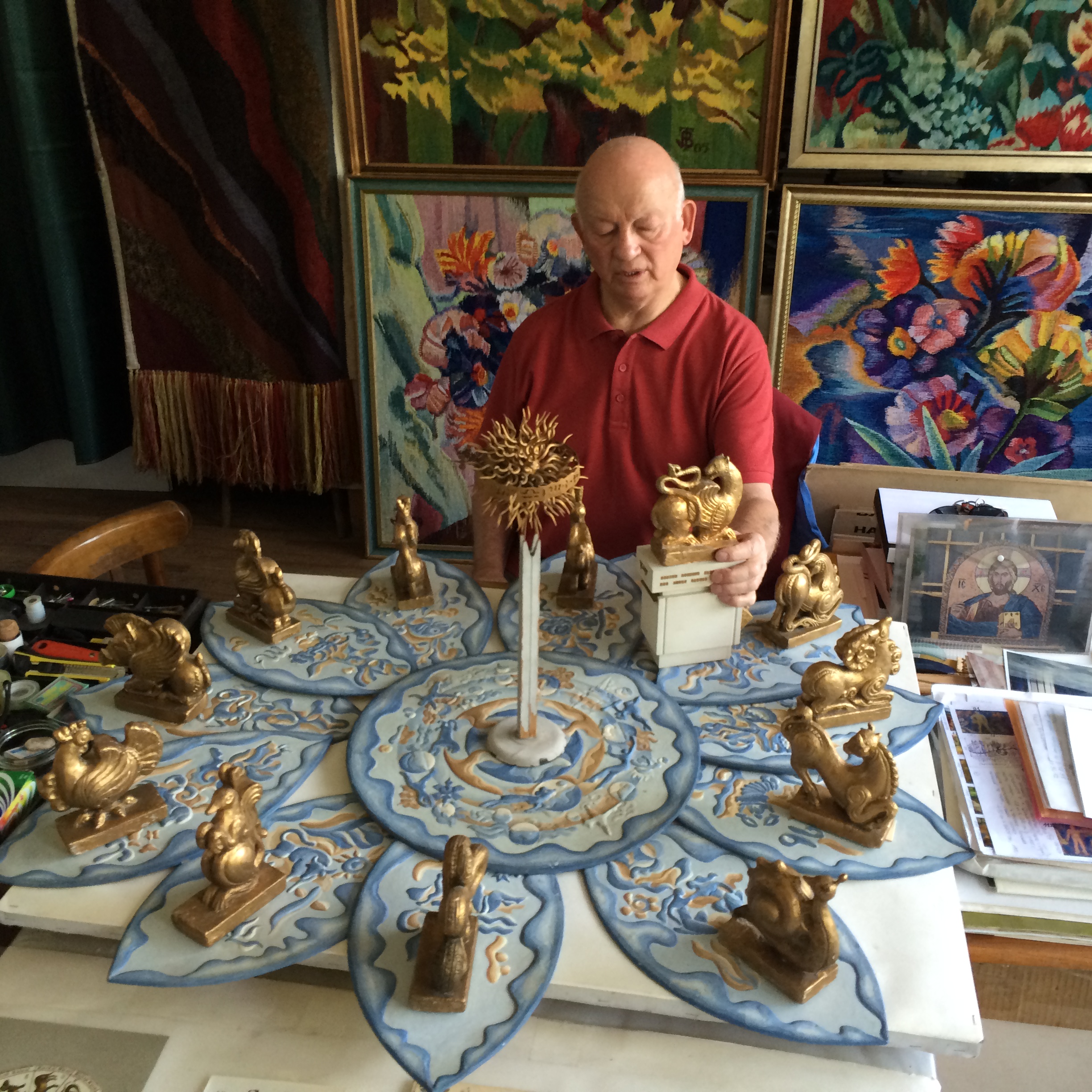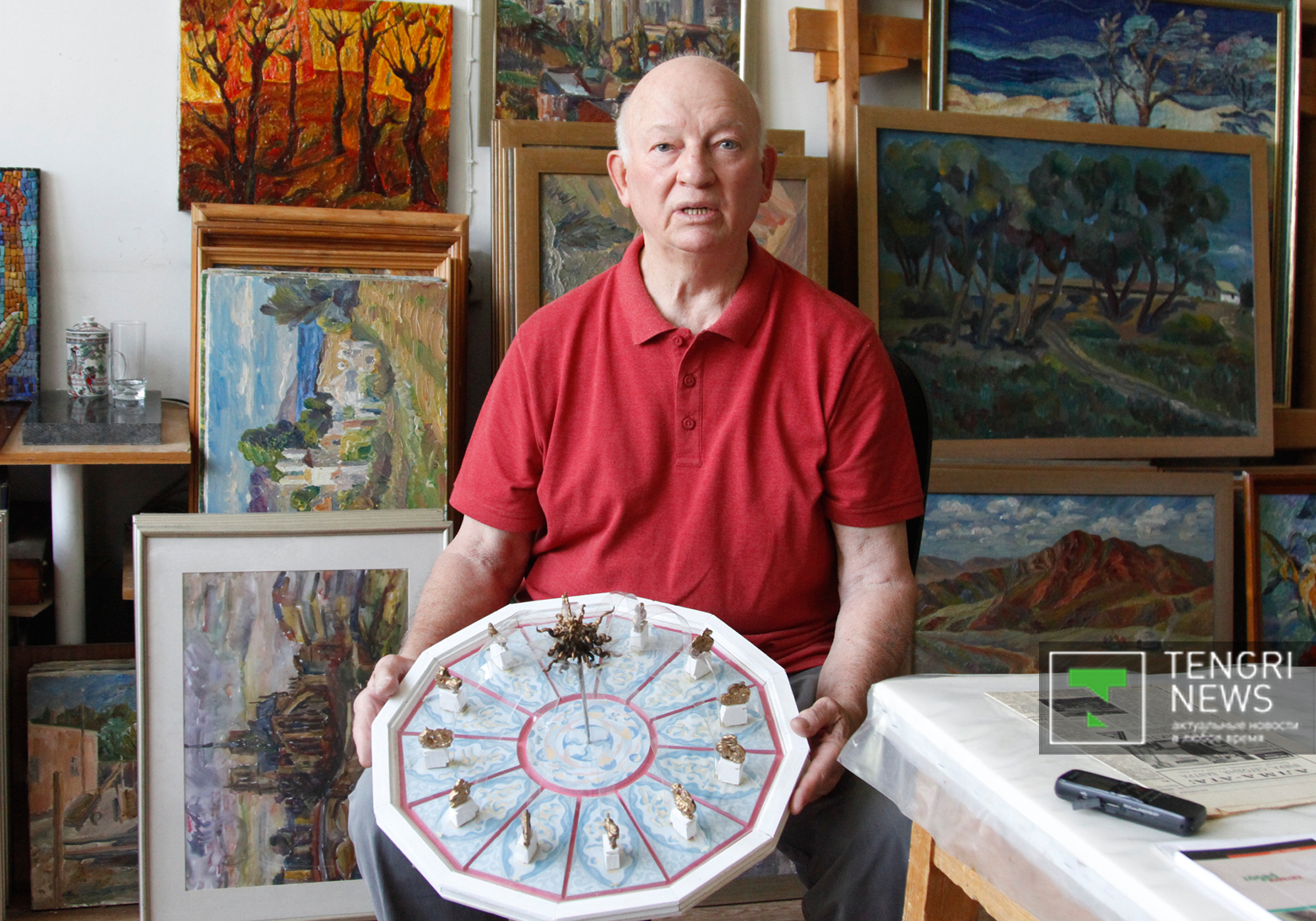 "Увидев Алма-Ату, я пришел в восторг. Такой чистый, зеленый, свежий город. Но фонтанов не было. И я предложил построить фонтан "12-годичный восточный календарь". В нем мне хотелось использовать звериный стиль искусства древних саков, скифов и других народностей, проживавших на территории нынешнего Казахстана. (...) По календарю годы начинаются с мышки, она и у меня стоит первая. Согласно легенде, мышка забралась на горб верблюда и первая увидела восходящее солнце, поэтому гороскоп начинается с нее. (...) Работа шла очень сложно. Отлить бронзу было негде. Все заводы были загружены, и к тому же материал-то был стратегический. Разрешение на работу с бронзой удалось получить на электро-механическом заводе в Алма-Ате. И хотя предприятие не было предназначено для таких тонких работ, получилось все на славу", - рассказал художник.