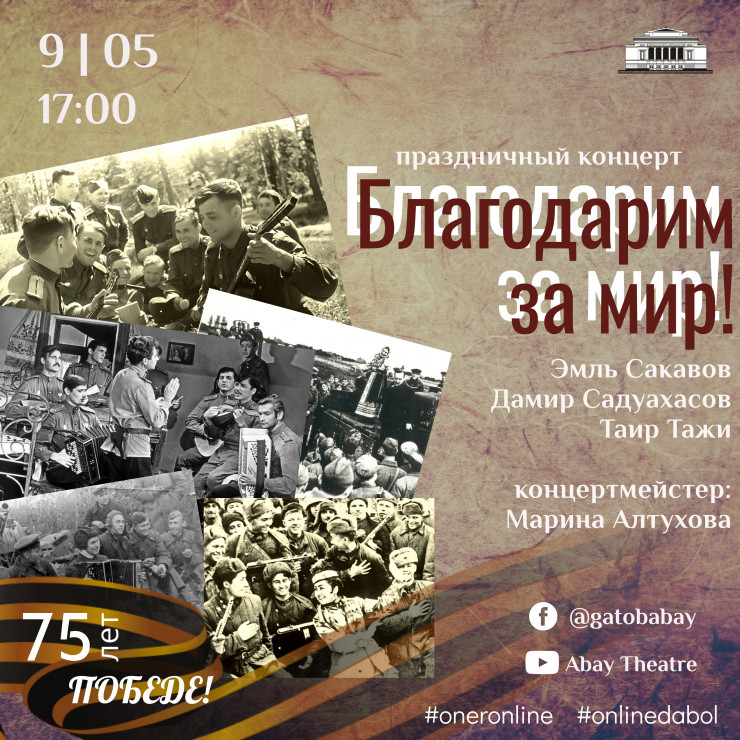 ГАТОБ имени Абая поздравляет всех своих соотечественников с праздником 9 Мая и желает всем крепкого здоровья и терпения, оставаться стойкими и благоразумными в это непростое время, беречь себя и своих родных! Театр поддерживает инициативы по организации культурных событий в онлайн-режиме "Өнер онлайн".