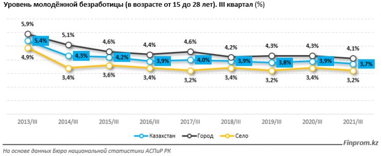 Уровень безработицы среди молодежи от 15 до 28 лет в третьем квартале 2021 года составил 3,7 процента, по сравнению с 3,9 процента годом ранее. В городской местности безработица значительно выше - 4,1 процента против 3,2 процента. В целом в стране уровень безработицы составил 4,9 процента.