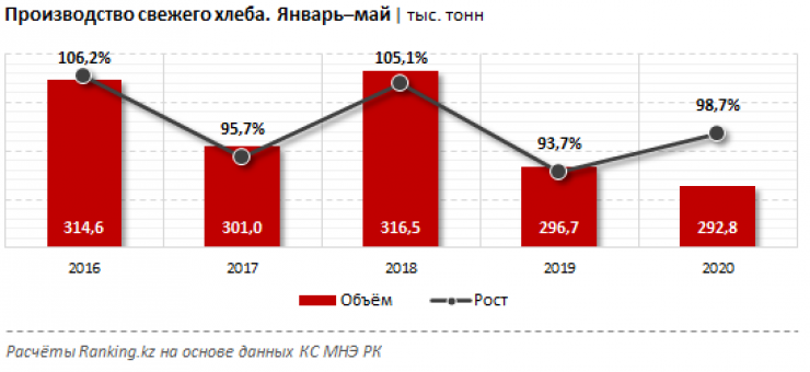 Производство свежего хлеба в Казахстане за январь – май 2020 года составило 292,8 тысячи тонн - на 1,3 процента меньше по сравнению с аналогичным периодом прошлого года.