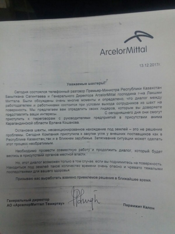 В Сети между тем появилось фото документа с подписью гендиректора "АрселорМиттал Темиртау", в котором говорится, что остановка шахты и несанкционированное нахождение под землей - это не решение проблемы.
