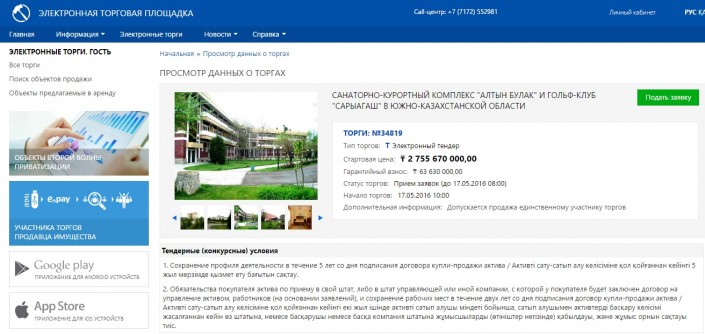 Согласно объявлению на электронной торговой площадке, эти объекты будут реализованы методом электронного тендера. Стартовая цена объектов - 2 миллиарда 755 миллионов 670 тысяч тенге. Гарантийный взнос составляет 63 миллиона 630 тысяч тенге. Начало торгов 17 мая 2016 года.