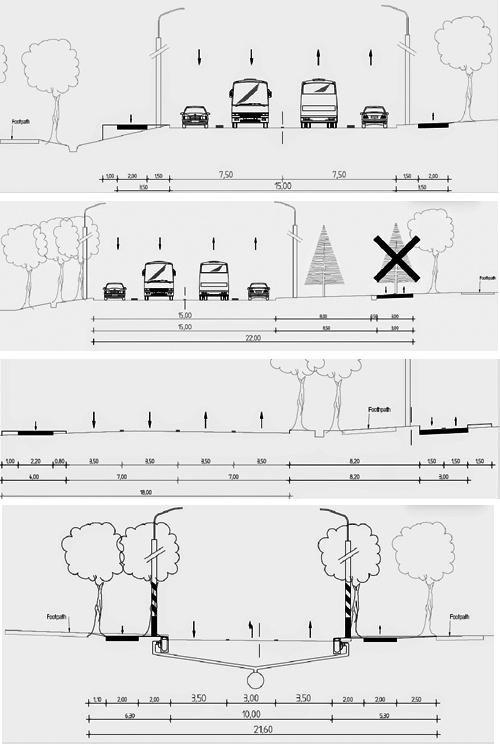 Таким образом, голландцы предлагают пересмотреть строительные нормы и правила. По подсчетам специалистов, минимальная ширина полосы для автомобилей должна быть 2,75 метра, а максимальная - 3,25 места. Для BRT должны быть полосы шириной 3-3,5 метра. По мнению голландцев, это даст возможность снизить скорость движения автотранспорта, что является одним из факторов безопасности. Также за счет сужения полос можно получить больше места для велодорожек.