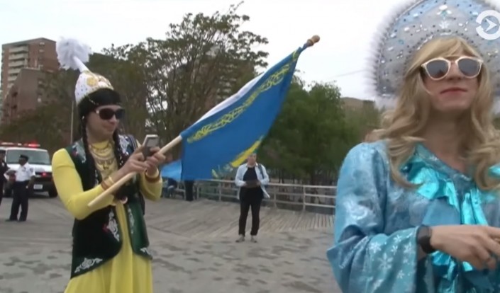 Издание "Голос Америки" показало сюжет о гей-параде в Нью-Йорке, на котором некий молодой человек в национальном костюме развернул флаг Казахстана и выкрикивал "Алга, Казахстан".