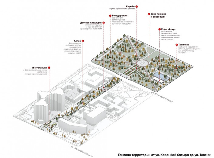 На участке от улицы Кабанбай батыра до улицы Толе би могут появиться инсталляция - музыкальный ключ, детская площадка в виде самолета, а также деревянная подвесная тропинка. По проекту на улице Байсеитовой будут проводить различные мероприятия.