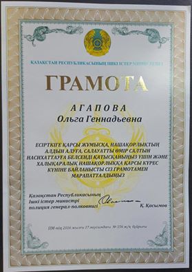 Казахстанке Ольге Агаповой вручили грамоту за содействие по борьбе с незаконным оборотом наркотиков. Грамота была приурочена и напечатана к международному дню борьбы с употреблением наркотических средств и их незаконным оборотом, который отмечается 26 июня. Правда, до Агаповой она дошла спустя полгода - 13 декабря документ доставили в ее офис, передает корреспондент Tengrinews.kz.