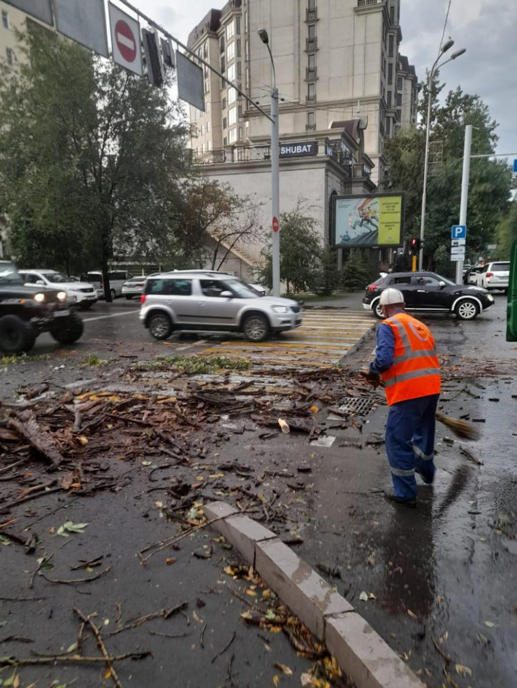 В службе спасения Алматы сообщили, что в период с 09.00 до 21.00 14 июля выпало 6,6 миллиметра осадков. Порывы ветра достигали 18 метров в секунду. Всего было зарегистрировано 12 случаев падения деревьев на машины. При этом количество пострадавших машин составило 16.