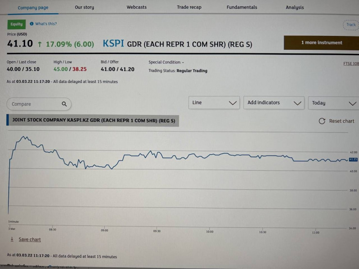 "Наши акции торгуются. Можете зайти на сайт Лондонской биржи. У нас сегодня торги на 172 000 акций, на 7 миллионов, мы в плюсе на 17 процентов на текущий момент", - сообщили в пресс-службе Kaspi банка 3 марта.