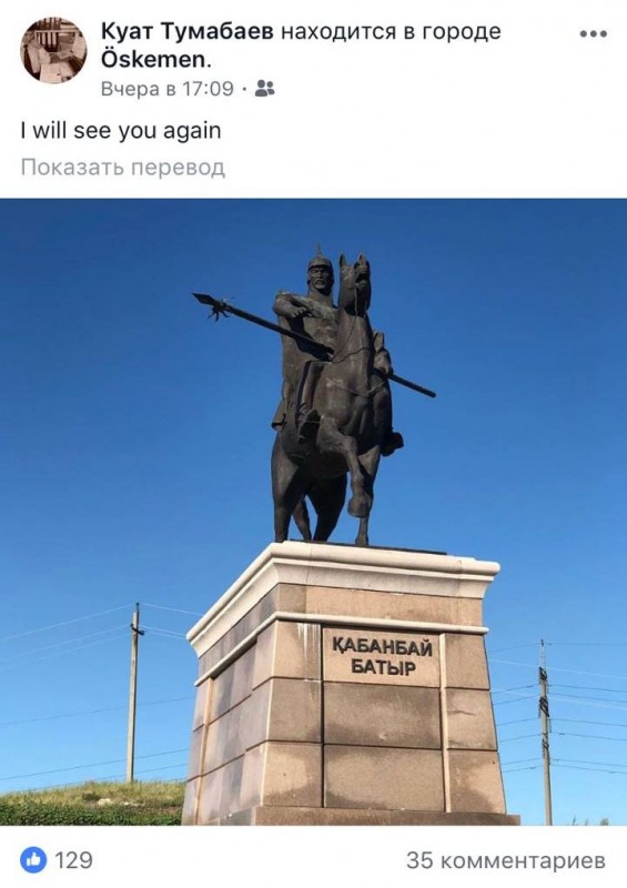 Экс-аким на своей странице в Instagram опубликовал фотографию памятника Кабанбай батыру, который расположен на выезде из Усть-Каменогорска, и подписал ее "I will see you again" - "Я тебя еще увижу".
