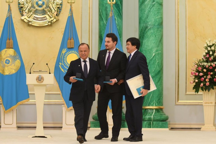 Также этой награды удостоен творческий коллектив театра "Астана Опера" за оперу "Абай". Награды из рук Президента получили Толеубек Альпиев, Сундет Байгожин и руководитель театра Галым Ахмедьяров.