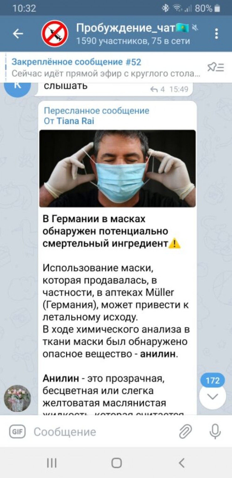 В telegram-каналах казахстанцы обсуждают сообщения о том, что в Германии в медицинских масках обнаружили опасный яд – анилин. Пользователи сочли, что использование таких средств защиты крайне опасно и может стать причиной множества серьезных заболеваний. Это манипуляция, передает Tengrinews.kz со ссылкой на Stopfake.kz.