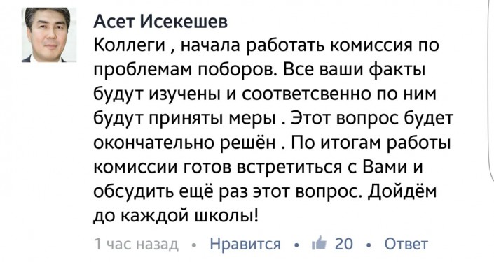 "Коллеги, начала работать комиссия по проблемам поборов. Все ваши факты будут изучены и, соответственно, по ним будут приняты меры. Этот вопрос будет окончательно решен. По итогам работы комиссии готов встретиться с Вами и обсудить еще раз этот вопрос. Дойдем до каждой школы!" - написал Исекешев в социальной сети.