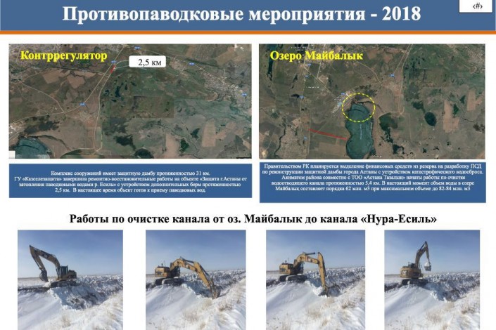 В настоящий момент объем воды в озере Майбалык составляет порядка 62 миллиона кубометров. Максимальный объем - до 80 миллионов кубометров. Акиматом Астаны завершена очистка действующего канала от озера Майбалык до канала Нура - Ишим протяженностью 5,4 километра, что говорит о готовности участка к паводку.