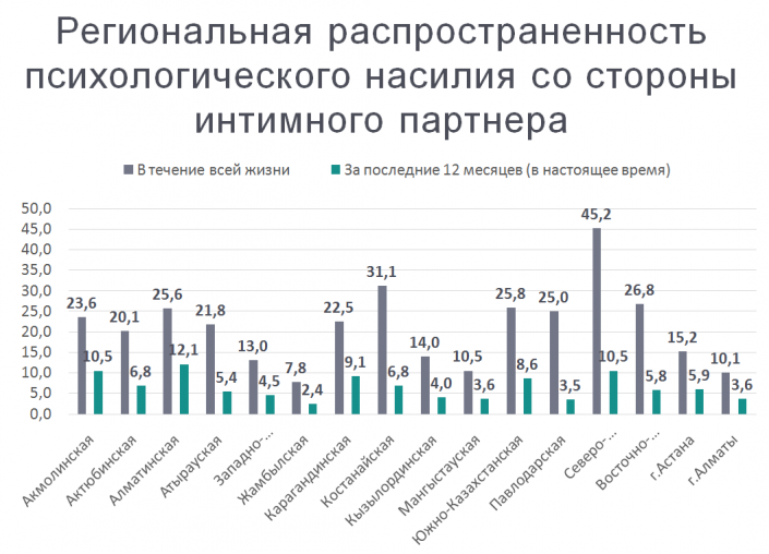 "Показатель психологического насилия со стороны партнера в течение жизни варьируется от 8 процентов в Жамбылской области и 10 процентов в Алматы, до 31 процента в Костанайской области и 45 процентов в СКО", - добавила Керимханова.