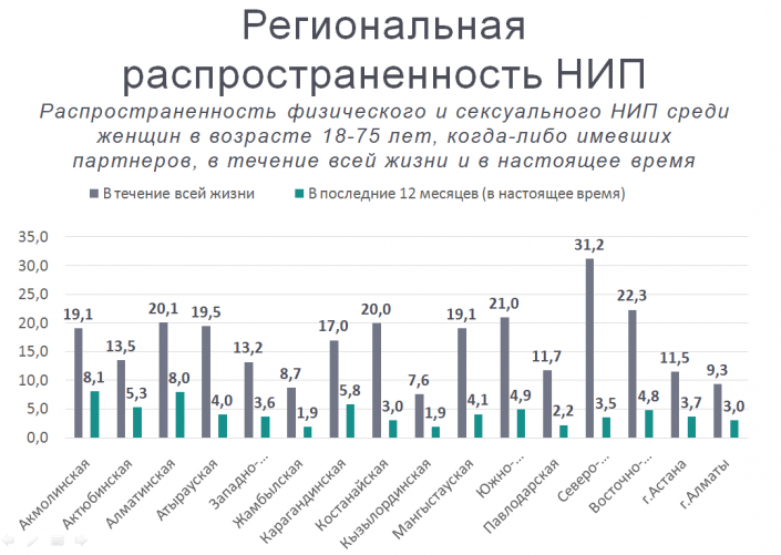 "Согласно полученным данным, среди женщин 18-75 лет, когда-либо имевших партнера, 16 процентов подвергались физическому и около 4 процентов - сексуальному насилию со стороны интимного партнера когда-либо в течение жизни. В целом распространенность насилия со стороны интимных партнеров в регионах Казахстана различается. Так, самая высокая распространенность наблюдалась в СКО и ВКО, а самая низкая - в Кызылординской и Жамбылской областях", - сообщила заместитель председателя Комитета по статистике МНЭ РК Гульнара Керимханова.