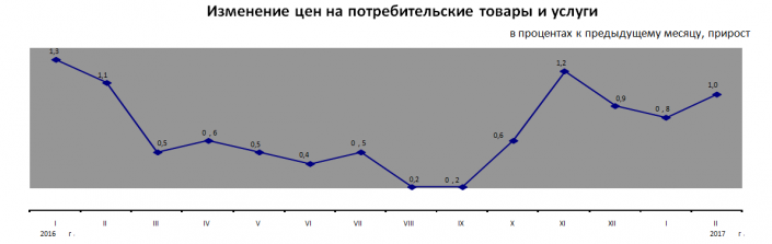 По состоянию на 21 февраля 2017 года цены на социально значимые продовольственные товары, включающие 33 наименования, выросли с начала года на 2,1 процента.