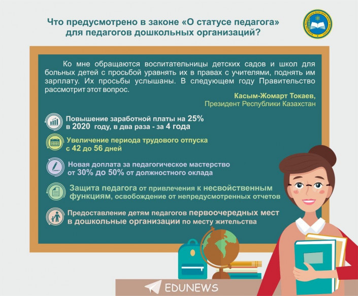 Вместе с тем уравнены в правах с учителями и воспитатели детских садов. К примеру, закон предусматривает повышение зарплат для педагогов дошкольных организаций также на 25 процентов в этом году. Также воспитателям увеличен срок отпуска с 42 до 56 дней. Кроме того, воспитателям вводится доплата за педагогическое мастерство от 30 до 50 процентов от оклада. Теперь воспитателей детских садов также не смогут привлекать к осуществлению несвойственных функций и освободят от непредусмотренных отчетов. Дети воспитателей детских садов также получат право на первоочередные места в детских садах по месту жительства.