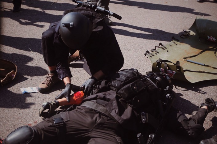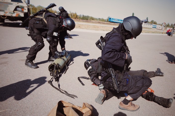 После конференции специалисты приступили к практическим занятиям и провели показательную антитеррористическую операцию. По сценарию группой преступников был организован террористический акт в центре города. На место прибыли сотрудники правоохранительных органов, которые вступили в бой, в ходе перестрелки два сотрудника спецслужб были ранены. Оказавшийся в составе боевой группы парамедик оказал медицинскую помощь на месте происшествия пострадавшим. Тяжело раненный был эвакуирован с места теракта на вертолете, второго госпитализировала карета скорой помощи.